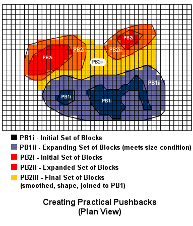 For example, PB2i represents a grouped sequence of blocks established by the Optimal Extraction Sequence. These groupings are expanded to create PB2ii by including later sequenced blocks so that a specific ore tonnage condition for the second pushback is achieved. The further addition of blocks to create PB2iii successfully joins pushback 2 to the previous pushback and creates smooth edges.