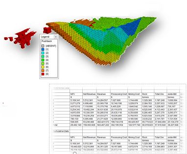 The generator then creates the pushbacks by re-sorting the OES to get contiguous blocks of ore that create a practical mining shape. These are accumulated in different combinations and the different combinations are compared until an optimum is found. This process has already been “pre-conditioned” by the way in which the OES was created with the proximity values which tended to group the ore into contiguous blocks.