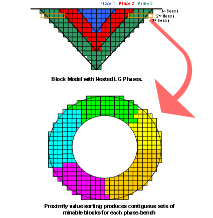 Calculation of the ultimate pit gives rise to 'phases'. Each phase can be thought of as consisting of horizontally “sliced” benches where each bench is made up of layers of blocks in the geological block model. An Optimal Extraction Sequence of the model blocks which represents the highest possible NPV is determined by considering each phase in turn and then within each phase considering each bench (a “phase-bench”) in turn from the shallowest to the deepest. This is based on the reality that in an open pit mine extraction has to proceed generally from the surface down!