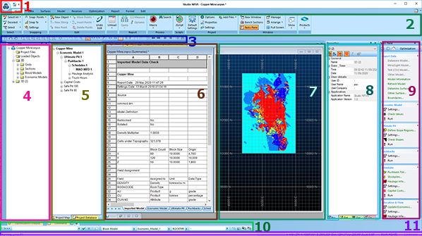 | 10 | Output Control Bars | Displays important information about tasks in your application, including Optimization Progress, Economic Model, Ultimate Pit, Pushbacks, Schedule and Sensitivity Analysis. | |