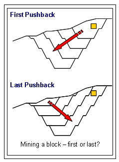 The highlighted block might be mined early as part of the first pit or later during pre-stripping of the last pushback – perhaps a difference in scheduling of 20 years. This difference makes it very difficult to determine the discount for that specific block and hence its value in the project.