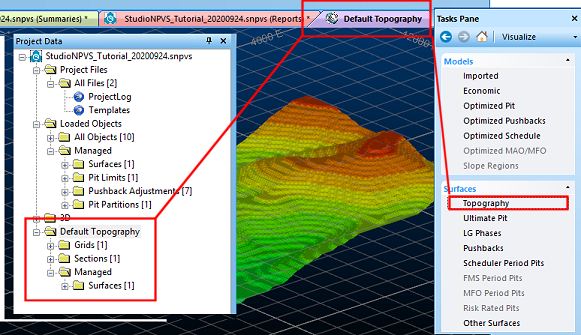 Studio NPVS also uses dedicated 3D windows for specific strategic planning visualization. For example, if you load the default topography for the project using the Task Pane's Visualize panel, a window entitled "Surface Topography" is created, and a new folder is added to the Project Data control bar tree: