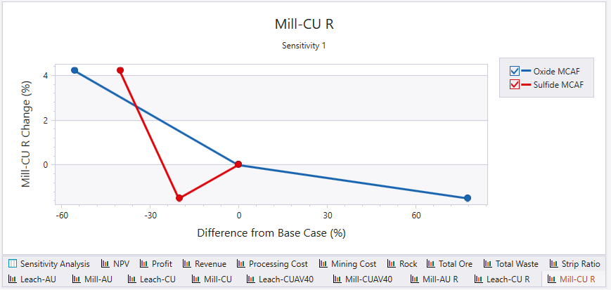 The Sensitivity Analysis chart results are also displayed in the Reports window, with each analysed parameter displayed as a different data series. For example, in the image below, the Processing Cost percentage change is shown for each parameter value (in this case, oxide and sulphide mining cost adjustment factors were analysed for values above the base value (oxide) and above and below the base case (sulfide):