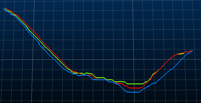 Once generated, surfaces appear in the 3D window and can be rendered as any other 3D optimization result. For example, the image below shows the 3 results for varying cost adjustment factors for sulfide (in the case below, the red line is the ultimate pit generate where MCAF is 1, green = 1.125 and blue = 0.75. The wireframe is rendered as an intersection with a N-S section: