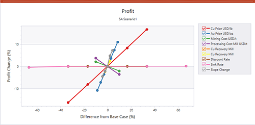 For example, a base case is defined that describes the initial run's default parameters, such as product price, mining cost, sink rate, slope range and so on. In the base case, the copper price ($/lb) is 4.0. The schedule is then solved to provide the optimal extraction sequence based on this commodity price in conjunction with the other scheduling parameters (financial, physical, operational etc.). You want to see the impact on the schedule should copper fall to 3.0, so a sensitivity run is defined with only the commodity price altered.