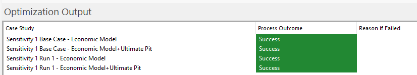 Batch processing begins. Economic Model and Ultimate Pit calculations are performed for all scenarios. You can see how processing is progressing by displaying the Batch Run Log window, for example: