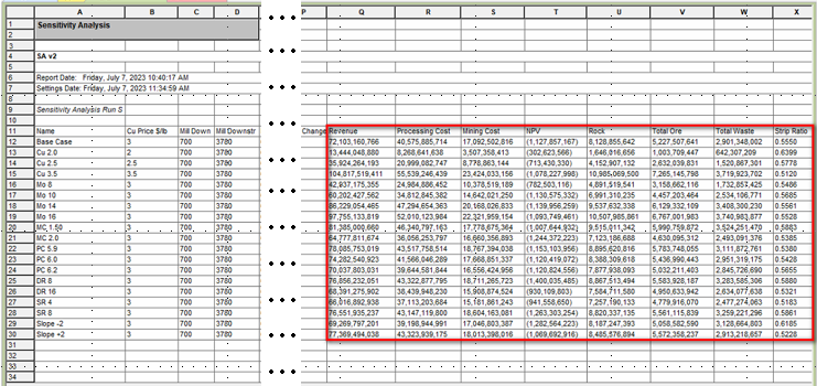 One a sensitivity batch run has been prepared (see below) and executed, results are displayed as a summary report showing the inputs per scenario and their corresponding results. In the example below, the run results are highlighted and not all parameters are shown: