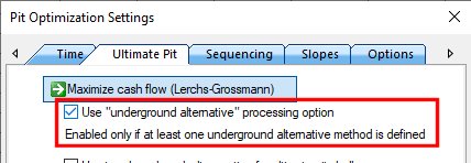 In your application, you can choose to automatically assess the different block values arising from both above-ground and underground methods and establish the most appropriate ultimate pit considering an underground mine.