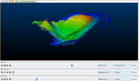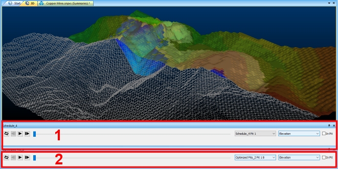 If multiple surface types are visualized, multiple Animation toolbars appear, allowing each loaded object overlay to be animated independently based on the appropriate animation attribute. For example, in the image below, both optimized LG phases and scheduler period pits have been selected on the Visualize panel. In the image below, secondary clipping is applied to reveal the cross section of both objects: