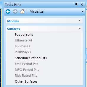 Once surface data has been generated for your project, say, by running the pushback generator, links become enabled on the Tasks Pane's Visualize tab.