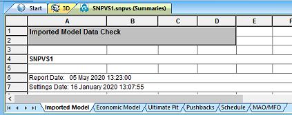 Summaries in spreadsheet format – Click a tab at the bottom of the window to see a particular view of the given type, for example; Imported Model. These views generally relate to the active Case Study (all summaries, most reports) but some do not; the latter have a Case Study ID (a number) appended to the tab label.