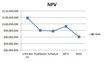 † The general NPV maximization problem is intractable for real mines. The methods that solve this problem are applicable to academic examples with less than 100,000 blocks and uniform slopes, and even then the computation time is counted in days.