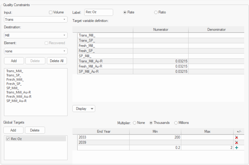 For example, 0.03215 can be used for Recovered Oz target with Recovered Grams variables – see below. With this target the Optimizer needs to make a schedule producing at least 200,000 recovered oz for all periods including 2033: