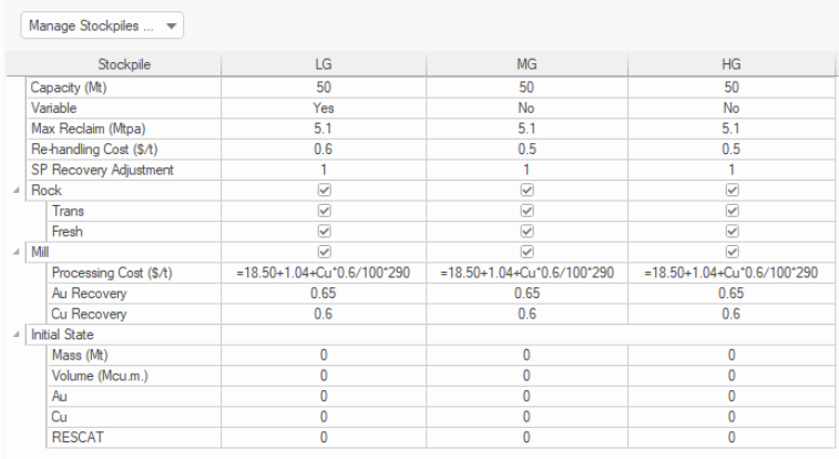 After the stockpiles are added there will be one column for each stockpile to define all stockpile parameters, for example: