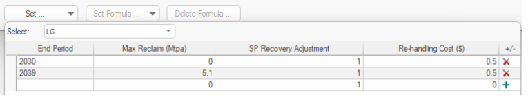 Note: In situations where Max Reclaim, Re-handling Cost or SP Recovery Adjustment vary in time click Set to open a screen where different values can be defined. A common example is shown below where the LG stockpile will not be reclaimed by the end of 2030. After that up to 5.1 Mt per year can be reclaimed (click to expand).