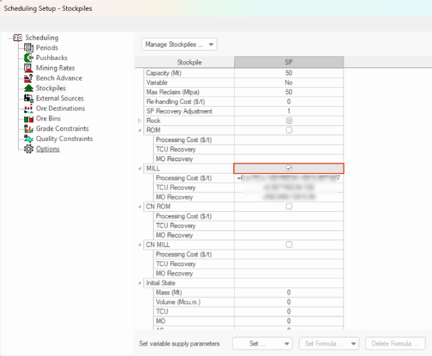 To set per-period stockpile maximum reclaim, recovery adjustment or re-handling costs, click Set. See Define Variable Stockpile Constraints.