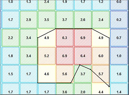 Note: Additional adjustment steps are still possible as not all block model cells that fall above the cut-off have been reached yet, using the defined step size. Using an outline with additional string vertices and using a different step size will yields slightly different results.