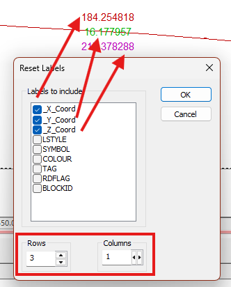 Choose how many Rows and Columns comprise the table used to display labels. Consider the following examples, where coordinate fields are laid out horizontally and vertically (the colouring was applied using the Style tab after the Reset).