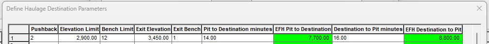 When defining haulage destination parameters, use this screen to define pushback and bench-specific times and equivalent flat haul (EFH) distances.
