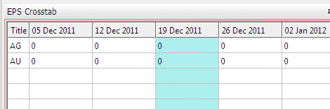 Presuming crosstab information has been set up in the connected EPS project (consult your EPS help for information on how to do this), during playback of an animation (using the Sequence Control toolbar), the data columns will update to show a consolidated or compound value for the given data range/phase in the animation. Before playback, each crosstab row will be shown in the bar and the following 5 data columns represent the next stage of animation, e.g. according to the M4DANI field: