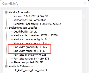 In the above case (an Nvidia GeForce RTX 2060 graphics card), you can visualize changes in line width (within the accepted range) for line widths varying by 0.125 or greater (Line width granularity) and will able to render a line using values in the 0.5 to 10 range only. Any value above 10 pixels, say (or the millimetre equivalent) will not be applied.