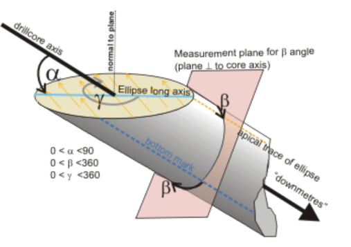 The "bottom mark" shown in the diagram above references an angle measuring convention whereby angles are measured from the lowest position on the core. Values can also be taken from the uppermost position. This baseline is commonly referred to as the core orientation line or reference line. Studio applications refer to the latter.