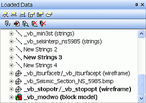 Current objects are displayed in bold text in the Loaded Data control bar. In the above image, multiple strings exist in memory (either as loaded or new objects), while only one wireframe and one block model object have been loaded. The current objects, only one of each type, are highlighted in bold.