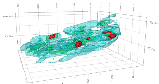 Creating a resource model is an iterative process with greater understanding of the geology and grade distribution being achieved as the study proceeds, and more data becomes available. Isoshell wireframes can assist in this process: surrounding an area in 3D space, they allow boundaries between rock types to be delineated, and enable you to model the spatial distribution of grades by representing different cutoffs. Where controls on mineralization are unclear, Isoshell wireframes allow different levels of a lower cutoff to be investigated - providing a suitable domain for grade estimation.