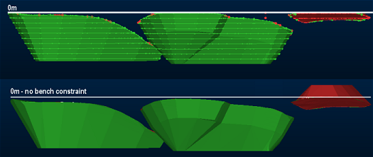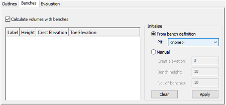 As the benches are defined manual, the Manual option is selected and a series 10 x 20m benches are calculated, starting at the Crest Evaluation (the upper elevation of the pit, which in this case is 0m):