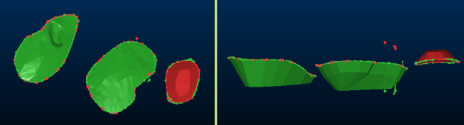 Displaying only the generated cut and fill volumes and swapping to a plan view reveals unwanted artefacts. With clipping turned off, the distinct cut and fill volumes are identifiable as green and red respectively, but you can see the unwanted fragments that surround each volume, showing a mixture of red (fill) and green (cut) "noise". There are also a pair of outlier data fragments at the original topography object boundary.