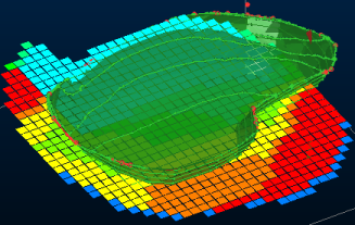 A block model overlaid onto a surveyed pit surface