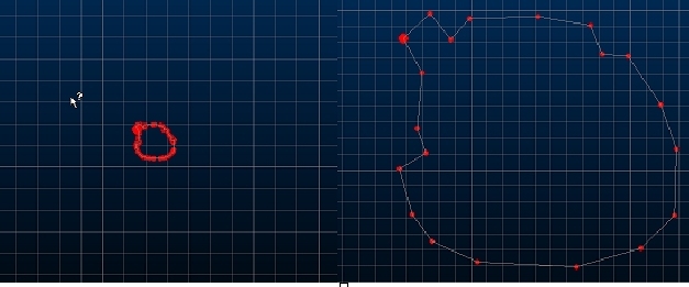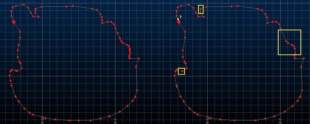 In the image below the original string is zoomed out to the relative scale shown. The image on the right shows the string after reduce-points, and returned to its previous scale: