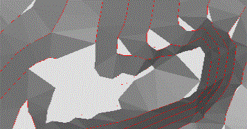 Consider the following example, which shows a magnified section of a topographical contour string file. The area highlighted in grey represents the area where most 'decision making' must be made due to the multitude of options for connecting separate vertices: