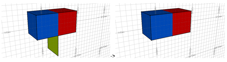 Remove interior triangles—if checked, remove all the triangles within a closed volume, essentially returning the outer shell. Note that if the internal triangles form a valid internal closed volume, then they will not be removed. In the image below, the combined boxes still have some triangles left over from the common edge. The section through the boxes show the triangles are removed after the wireframe cleaning: