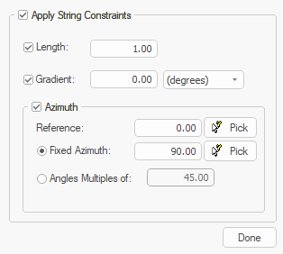 For example, to only permit azimuth changes of 45 degrees whilst drawing, use Angles Multiples of and check both Apply String Constraints and Azimuth. Similarly, ensure all new string segments are of a fixed Length, with the new segment pointing towards the new click positions by only enabling the Length constraint.