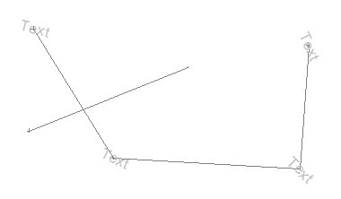 Dip: if your data object contains a numeric column containing Dip and Dip Direction values, these can be applied to your labels. Select the column representing the dip and direction then apply it your object. For example, the image below represents a geological feature object with four vertices. Each vertex in the table is supported by a dip (TEXTDIP) and dip direction (TEXTDIPD) attribute. When the label is applied with these columns specified, and the All points option is used (see above) each label instance is oriented according to a record-specific value: