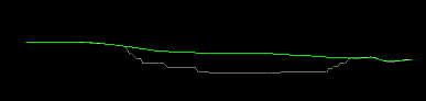 In the image below, two wireframe intersections are shown overlaid in a vertical section, representing an unmined topography (green) and open pit profile (grey).