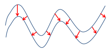 Thickness is the distance inside a wireframe from one side to the other. In some cases this may be measured within a closed wireframe, but in others multiple DTMs may represent the interfaces between different volumes. Note that sense of what is inside a wireframe is determined by the direction of the triangle the point is on. For properly verified objects, this should always underneath true DTMs, and inside of fully-closed wireframes.