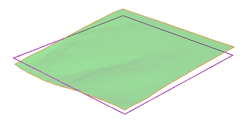 You can either output a string that lines up with the selected plane (a "2D" boundary), or you can output a string object representing the elevation of the boundary of each point of the object (a "3D" boundary), for example, in the image below, the same topography wireframe surface has been converted to a hull string. The orange string represents the output of a horizontal projection with the Use elevation check box disabled, whilst the purple line shows the default setting, that is, projecting the boundary line to the currently active section: