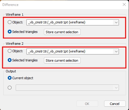 For example, the wireframe-difference command, available in many Studio products, displays the Difference screen which allows either object or selected triangle data editing for either of the inputs: