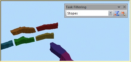 Datamine Task Scheduler allows you to filter your activities to show data relating to a particular object grouping, for example, stopes or complex solids, for example. DTS InTouch will automatically detect the filtering settings made in the external DTS application and, where a schedule is linked, will immediately update the view in the DTS InTouch data window to show only data that is relevant to the currently selected DTS filter.