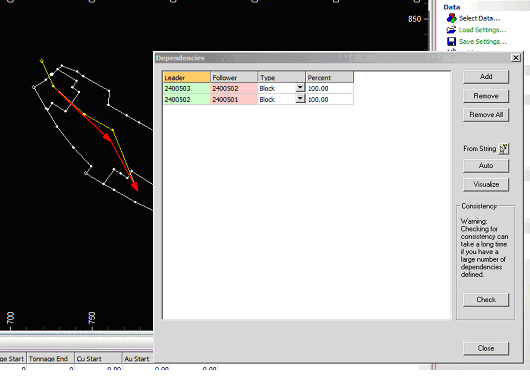 Block dependencies can be automatically generated by creating a new string object that connects the Blocks that are to be linked. The string should be drawn in the plane of the Blocks and the Perimeter Selection Mode should be turned off when digitizing and using the string object. When using the From String option to create dependencies, for best results, filter or clip down to the current mining level, then select the string. This avoids situations where the dependencies can jump between benches above or below, depending on the view in the 3D window