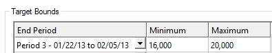 7. In the Target Bounds group, add at least one set (row) of End Period, Minimum and Maximum parameters, click Apply.