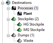 Destinations are the end points in the scheduling of materials. For example, waste dumps, stockpiles and processing plants.
