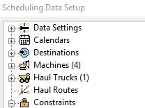 The Scheduling Setup dialog is used to load and save project settings, define the various scheduling data objects, set how fields are treated, and define bench settings. It is also used to configure your planning calendars, machinery and haulage settings, define operational constraints and activities and export data to other systems.