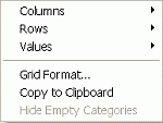 Field Details: Columns: select a column to report by unique column values for the selected period; select [Fields in Table] to reset the columns to default view. Rows: select a row to report by unique row values for the selected period; select [Fields in Table] to reset the columns to default view. Grid Format: display the Grid Format dialog (see above). Copy to Clipboard: copy the contents of the displayed grid to the clipboard. Hide Empty Categories: this pane lists the available table grid columns. |