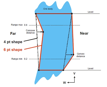 The lateral position of the points can be constrained relative to a line joining the stope corners (see the dotted lines). The lateral position can be constrained to an outwards limit (the "convex" distance), and/or to an inwards limit (the "concave" distance). In this way each wall (near, far, hangingwall or footwall) can be constrained to be either concave only, convex only, or any position in between a convex/concave limit. A straight wall would logically be specified with a 2 point wall, but until this is available, the concave/convex distance can be specified as a small non-zero value to restrict the lateral movement.