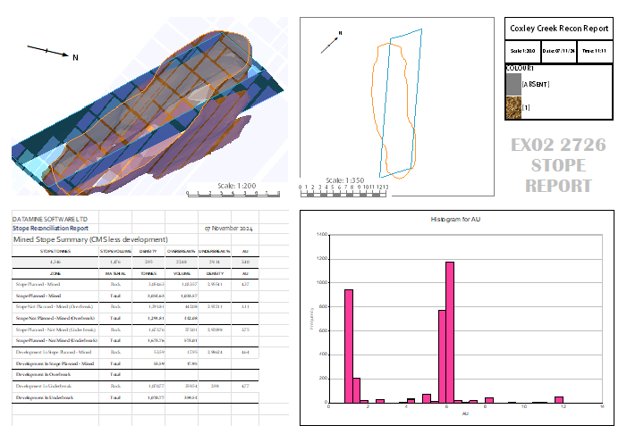 In the image below, for example, a stope reconciliation report plot shows a projection (top right) where all data in front of the sections passing through the designed volume and surveyed volume is clipped (there's some transparent block model cells there too, but ignore those).