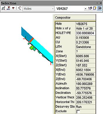 The drillhole Compositor tools are useful for investigating summary information for a selected drillhole interval in Plots, Logs or Tables and additionally saving the selected interval to an intersections table. They consist of the Selection toolbar and Compositor control bar functions. The compositor can also be used in the 3D window.