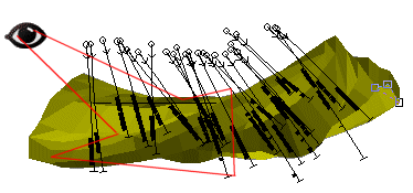 For example, in the image below, a wireframe orebody is viewed in the direction indicated by the red arrow: